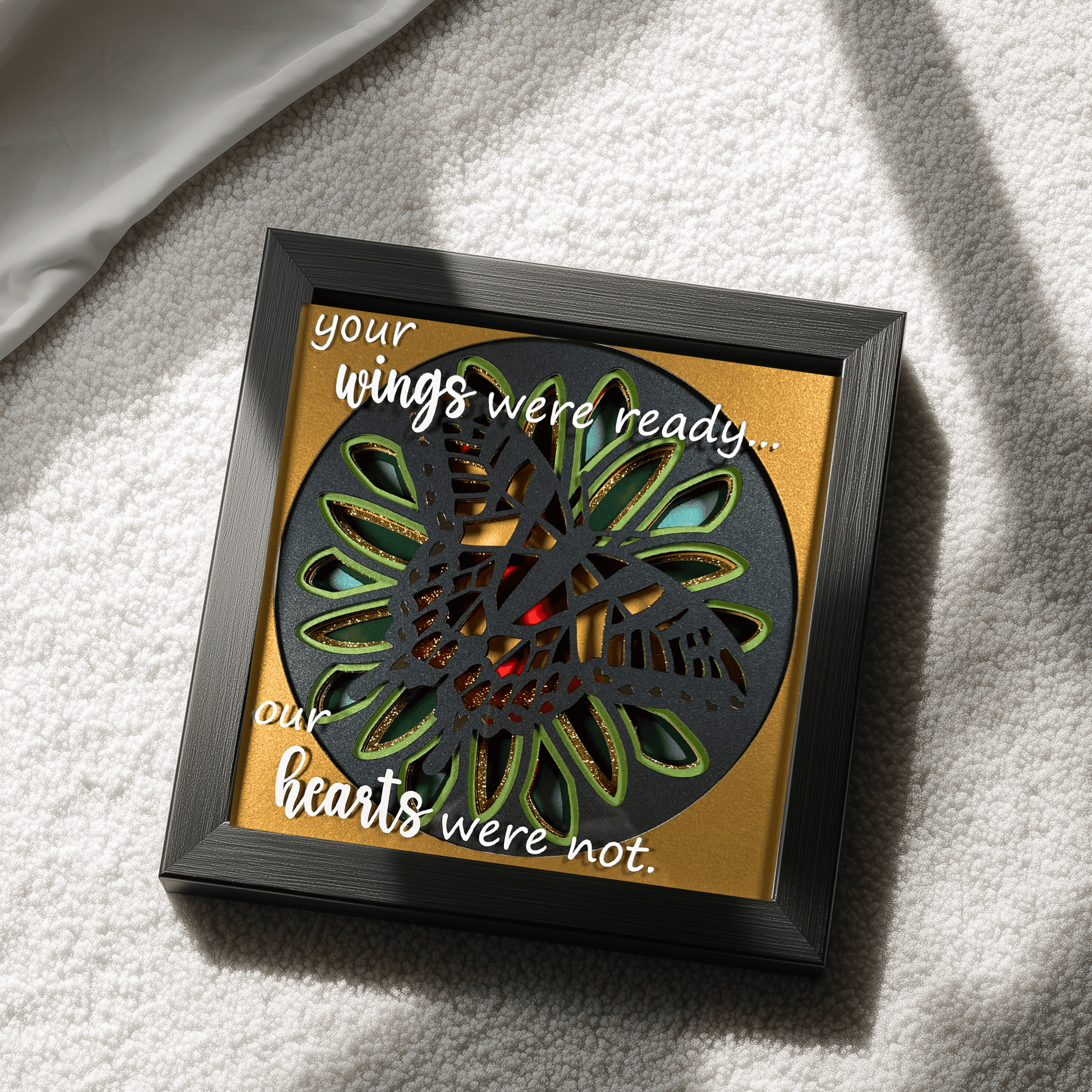 - The phrase, “your wings were ready… our hearts were not.” is carefully crafted in premium vinyl and elegantly placed on the glass front of the frame.