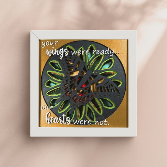 Honor the memory of a loved one with this beautifully crafted butterfly shadowbox, designed to offer comfort and remembrance. This unique piece features a stunning butterfly made from 10 layers of premium cardstock, creating a captivating 3D effect that brings depth and elegance to any room.