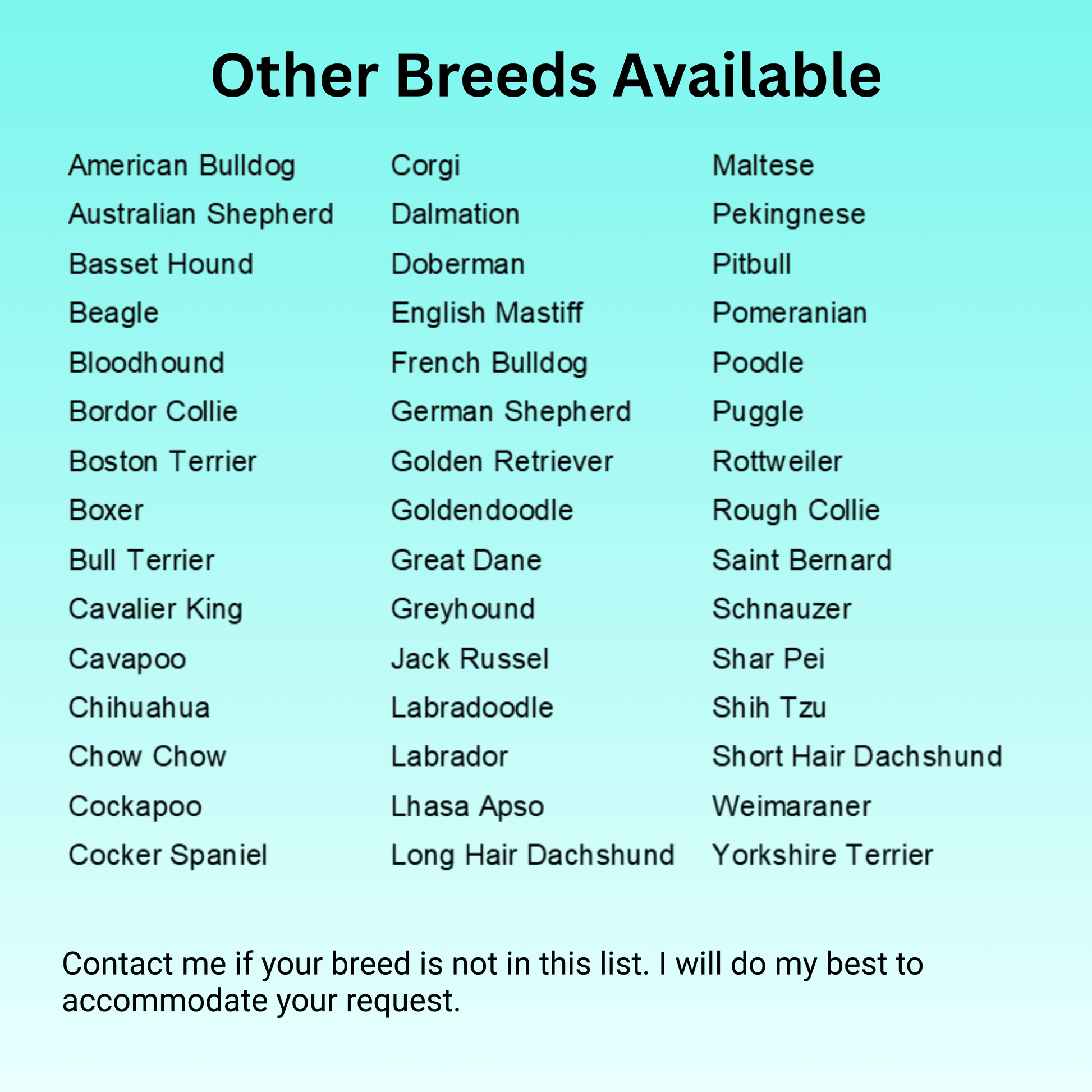 Please send me a message if you do not see your specific pup in the list of breeds available. I will do my best to create a shadow box that celebrates your special canine companion!