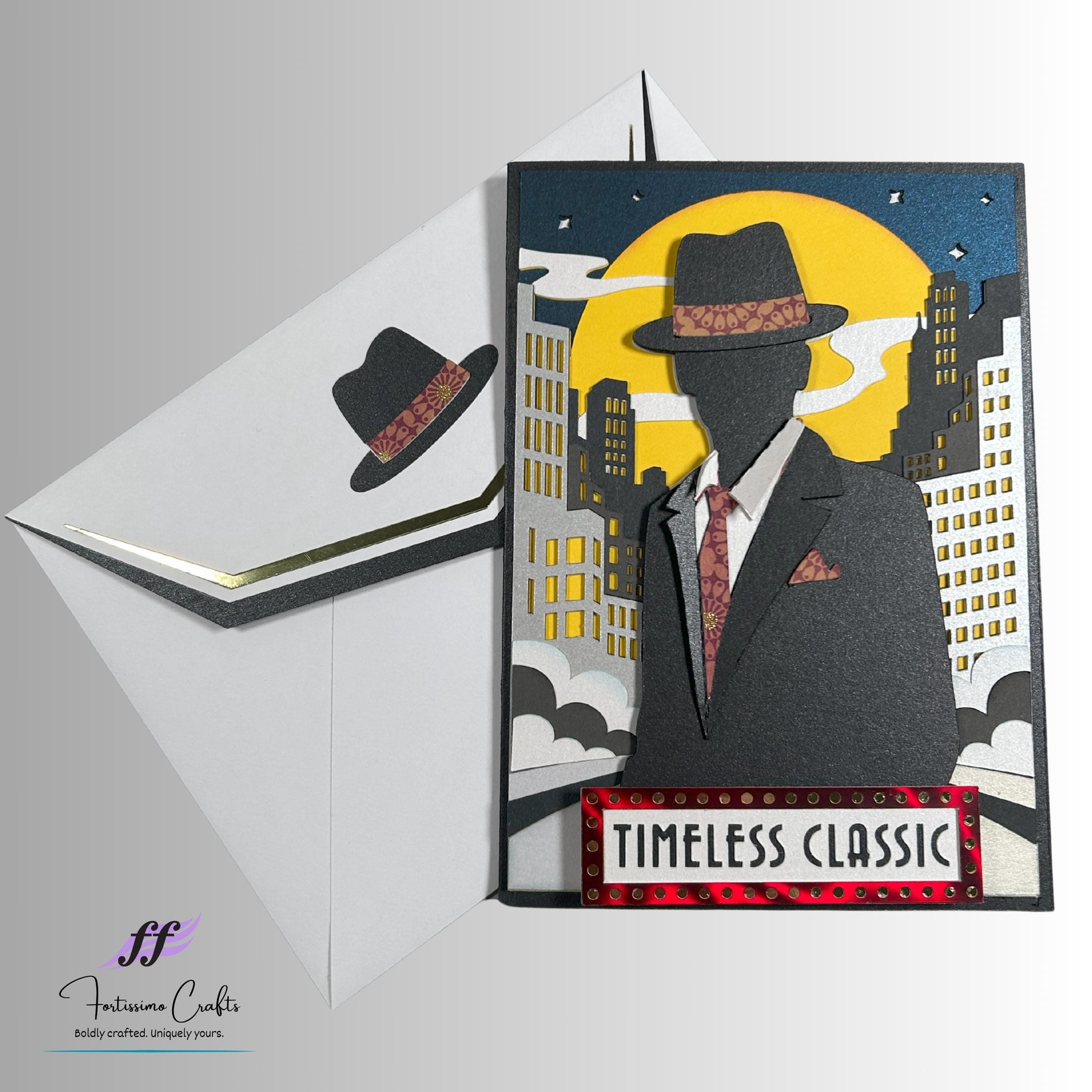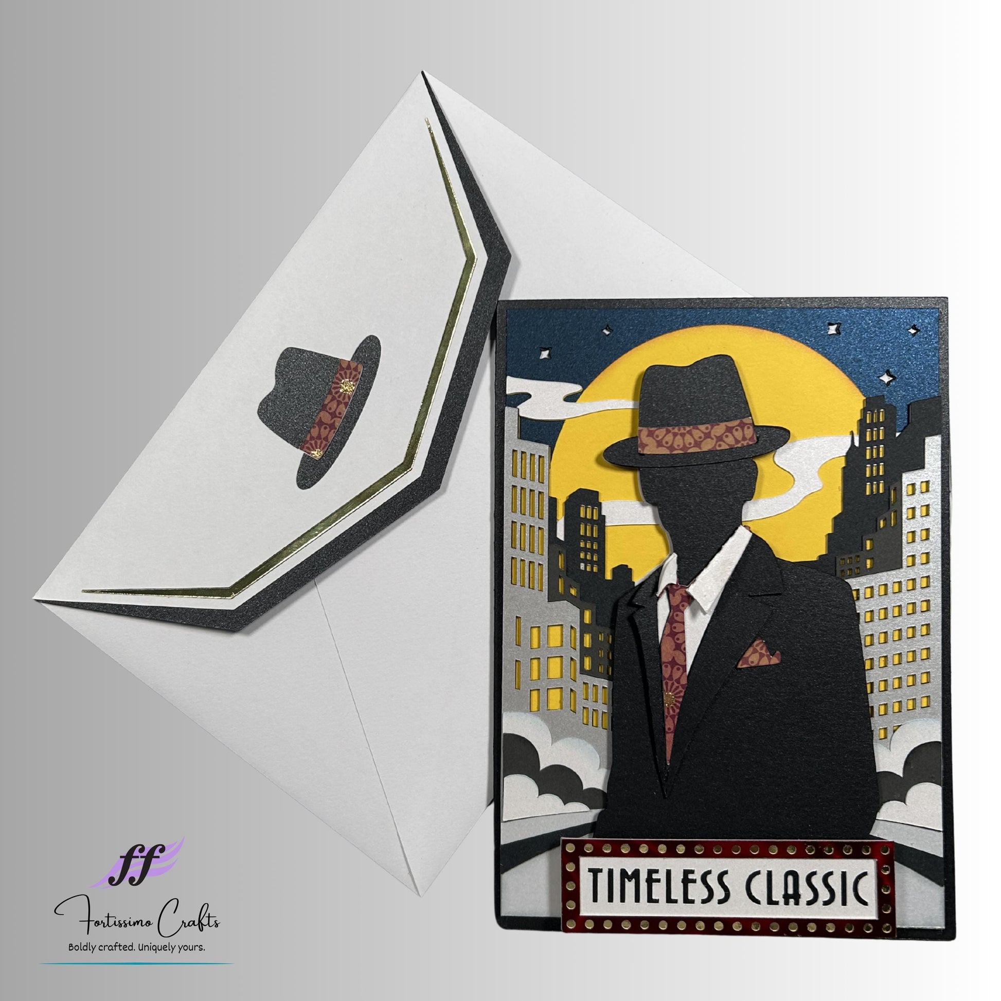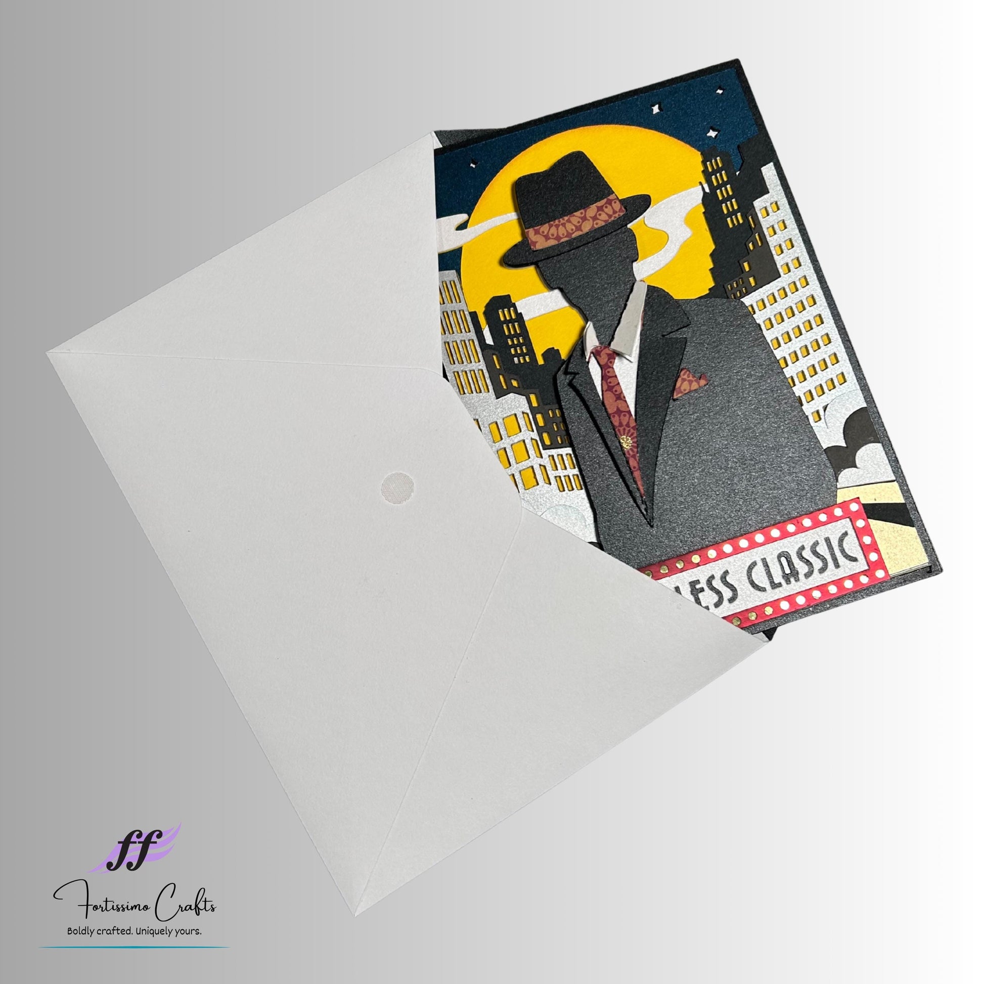 The “Timeless Classic” handmade card is designed to leave a lasting impression, evoking nostalgia and contemporary flair in a single sweep. At its heart, the card features the striking silhouette of a man standing confidently before a sweeping cityscape, the grandeur of high-rises and rooftops stretching behind him. A luminous moon rises gracefully behind him softly illuminating drifting clouds in the twilight sky. The card, measuring 5” x 7”, is crafted from premium cardstock and hand-finished with meticulous detail, making each card a unique work of art. A bold marquee at the bottom proudly proclaims, “Timeless Classic,” making this card a perfect choice for those celebrating milestones, achievements, or simply the everyday elegance of life’s journey.