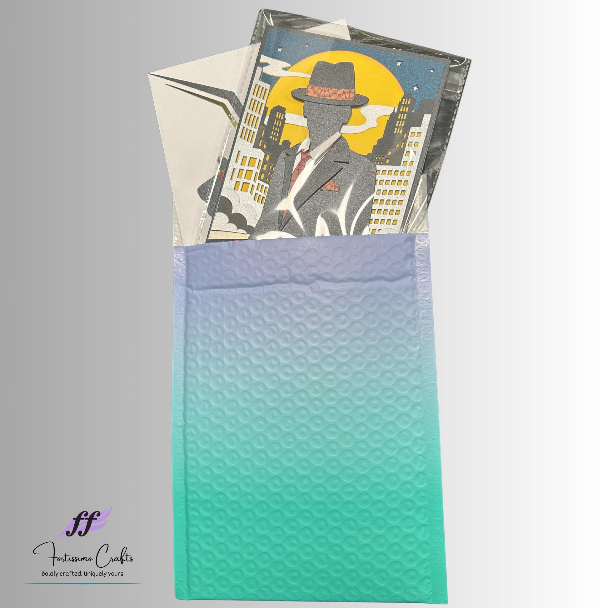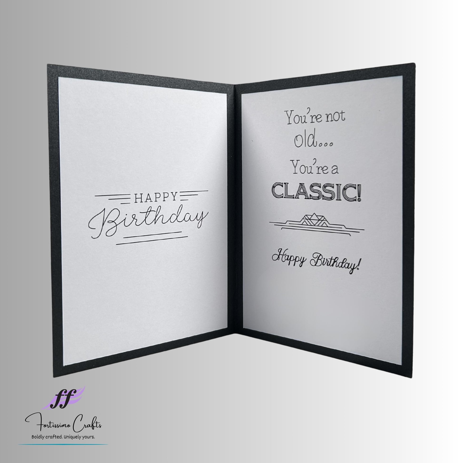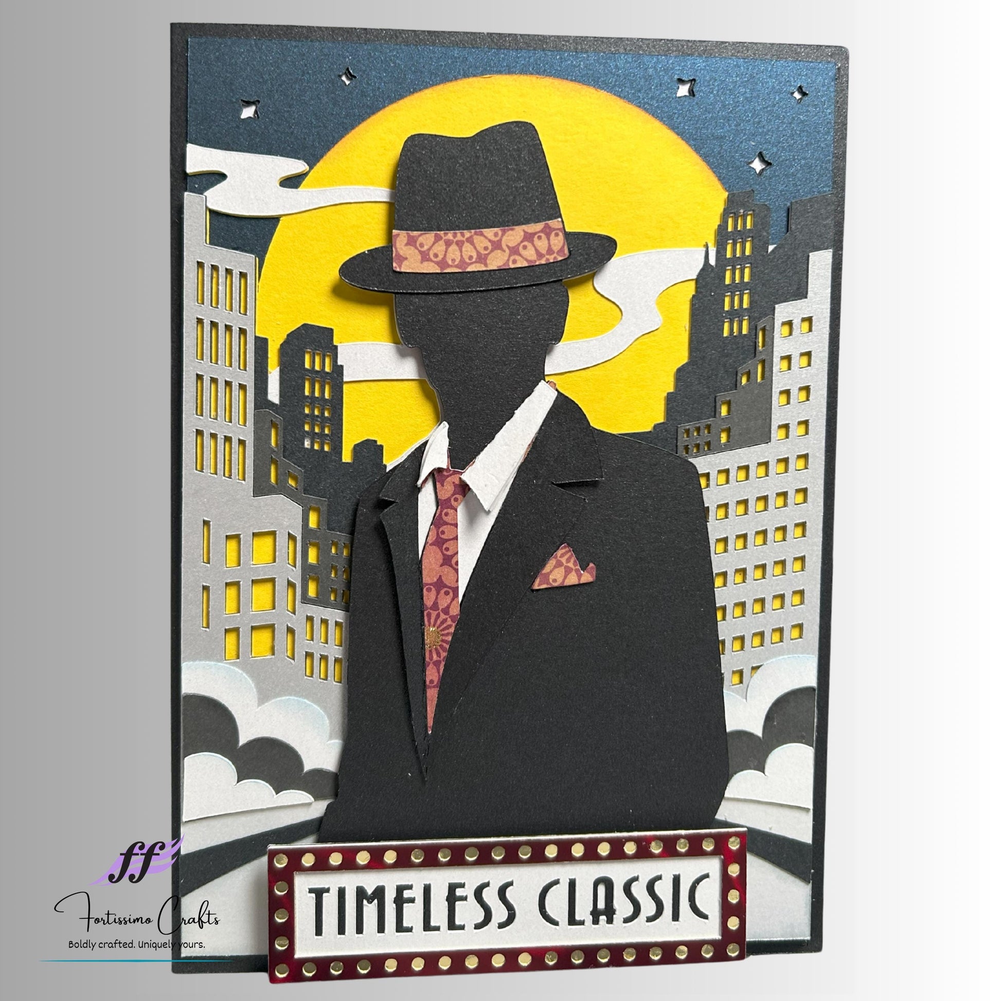 The “Timeless Classic” handmade card is designed to leave a lasting impression, evoking nostalgia and contemporary flair in a single sweep. At its heart, the card features the striking silhouette of a man standing confidently before a sweeping cityscape, the grandeur of high-rises and rooftops stretching behind him. A luminous moon rises gracefully behind him softly illuminating drifting clouds in the twilight sky. The card, measuring 5” x 7”, is crafted from premium cardstock and hand-finished with meticulous detail, making each card a unique work of art. A bold marquee at the bottom proudly proclaims, “Timeless Classic,” making this card a perfect choice for those celebrating milestones, achievements, or simply the everyday elegance of life’s journey.