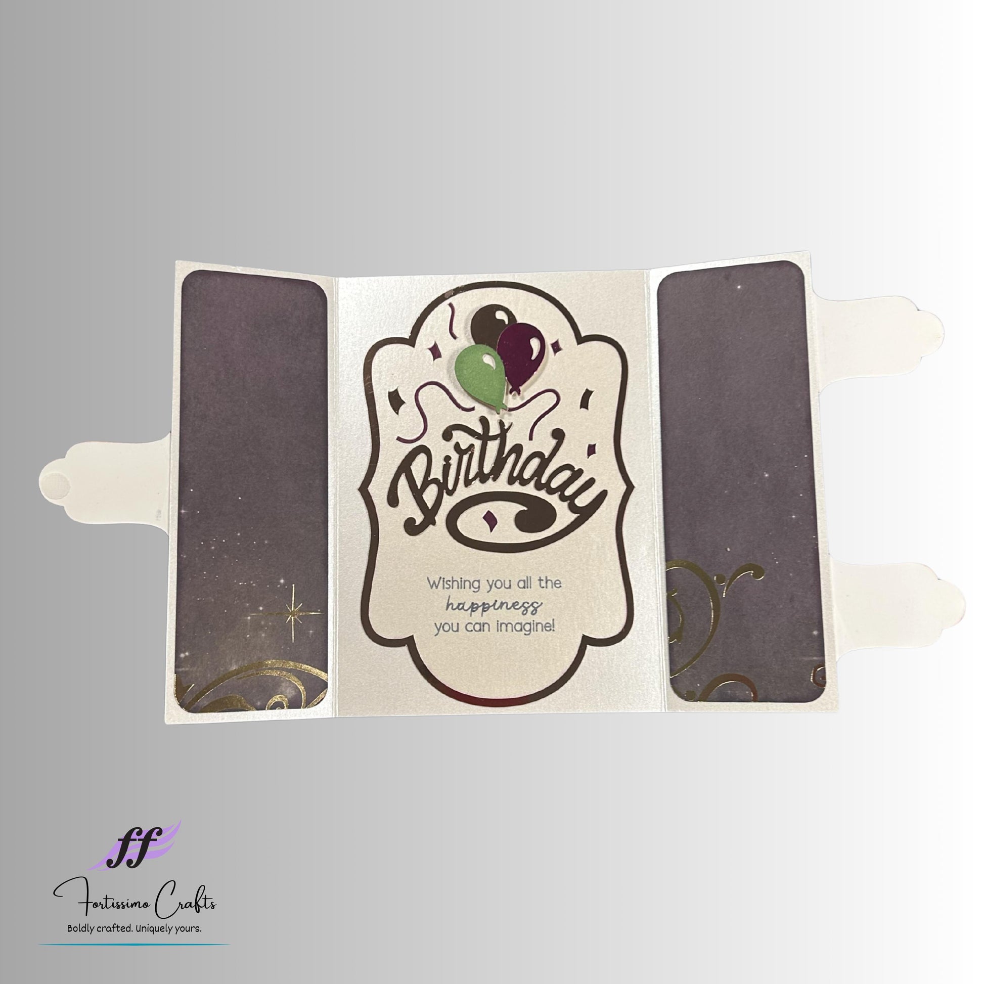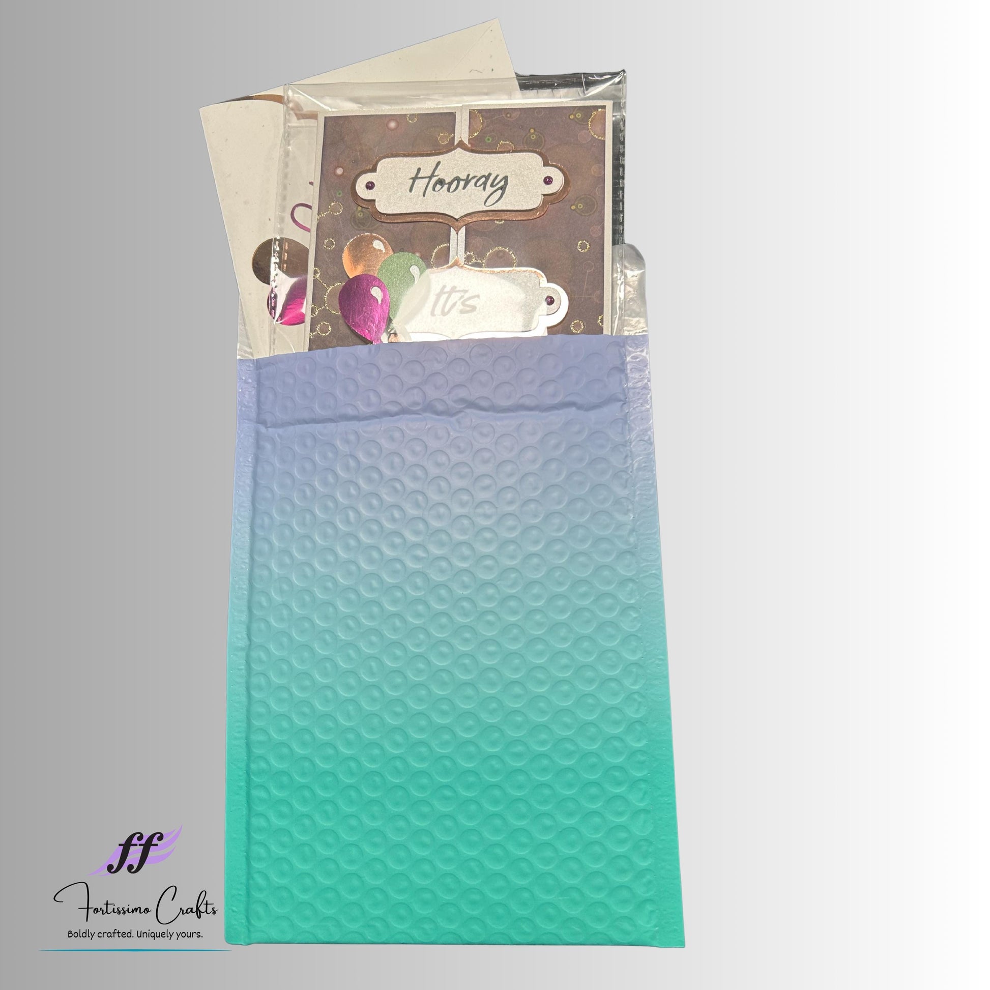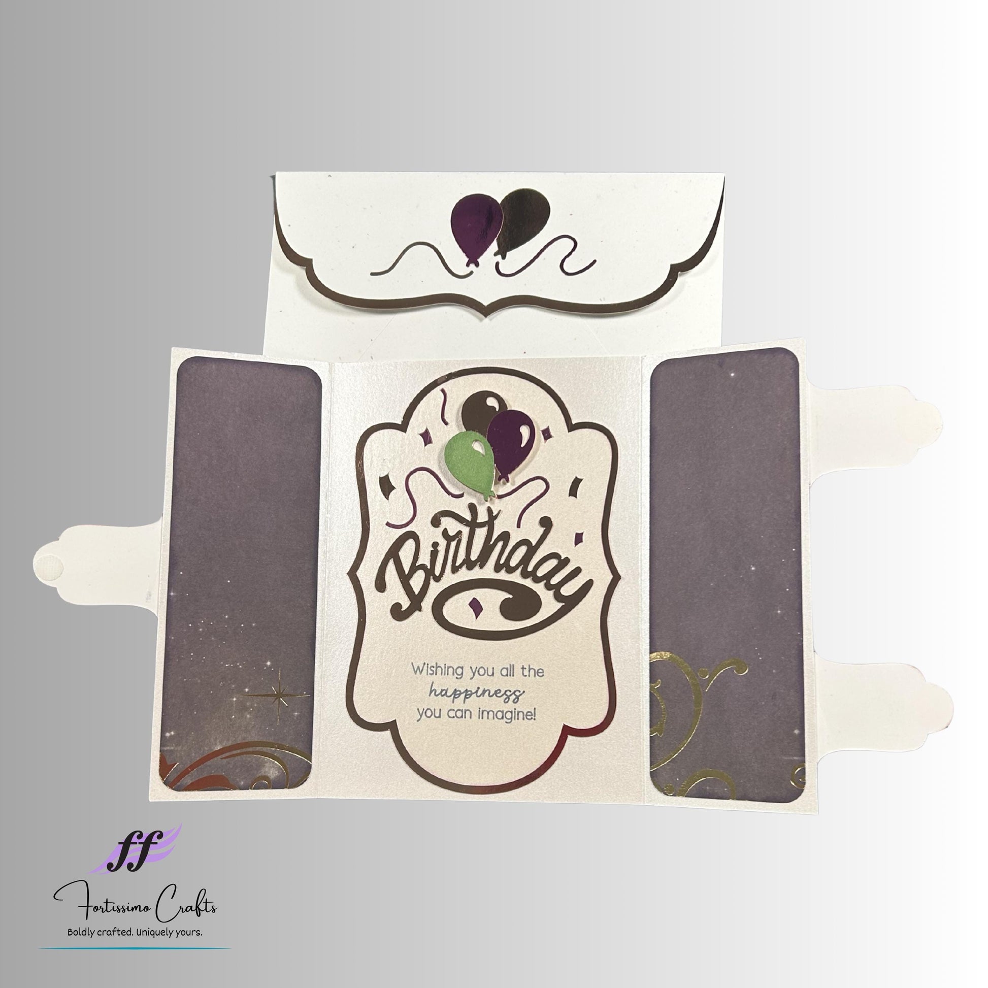 The card is accompanied by a coordinating envelope, also handmade from premium cardstock. The envelope flap is subtly lined in a coordinating color with cut out balloons on the flap to showcase the liner. A hook and loop closure is standard on the flap of the envelope to allow the card to be opened without damaging the envelope. A double-sided tape closure is available upon request.