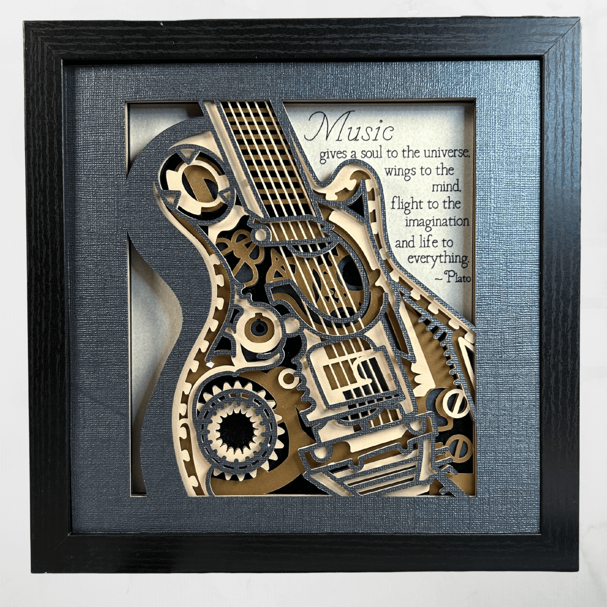 Plato’s Guitar Steampunk Shadowbox – Handcrafted 3D Layered Art, Framed