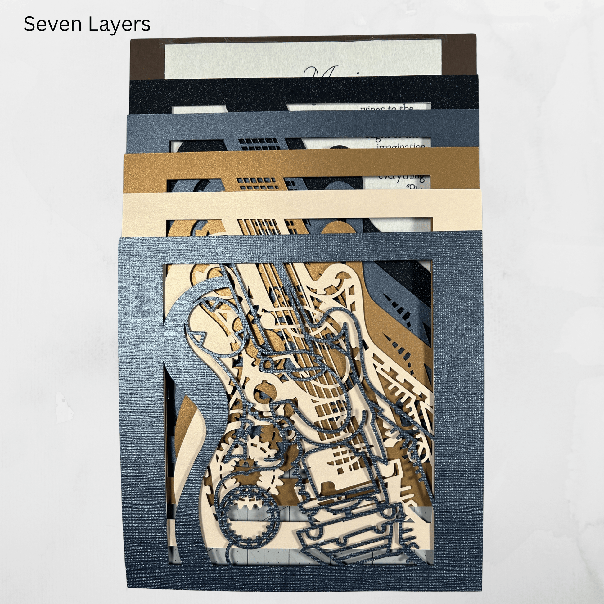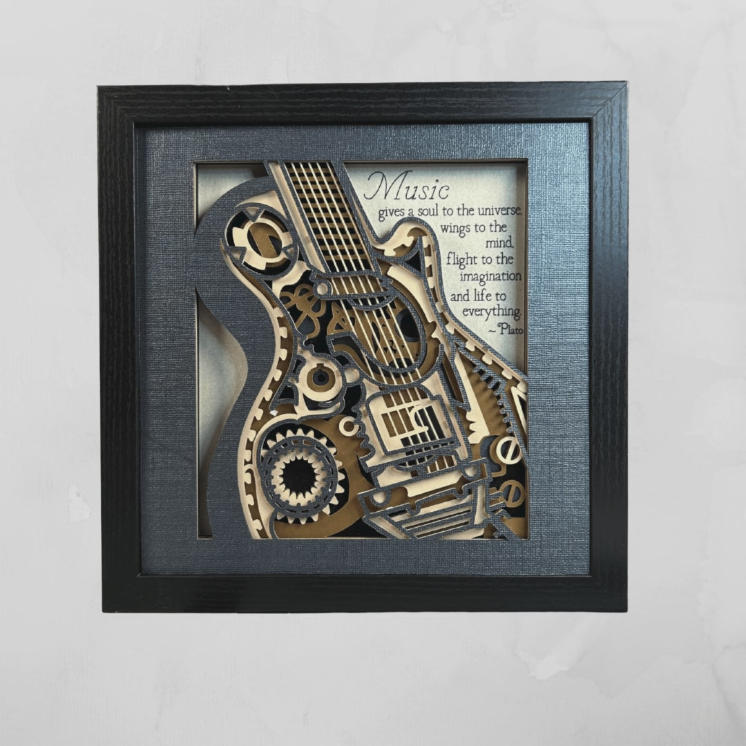 Immerse yourself in the harmony of art and music with this stunning 3D shadow box, thoughtfully handcrafted from premium cardstock. The centerpiece features a beautifully detailed guitar, its inner workings brought to life in an imaginative steampunk style. Gears, cogs, and intricate mechanical elements blend seamlessly, creating a captivating scene that celebrates both vintage innovation and musical creativity.