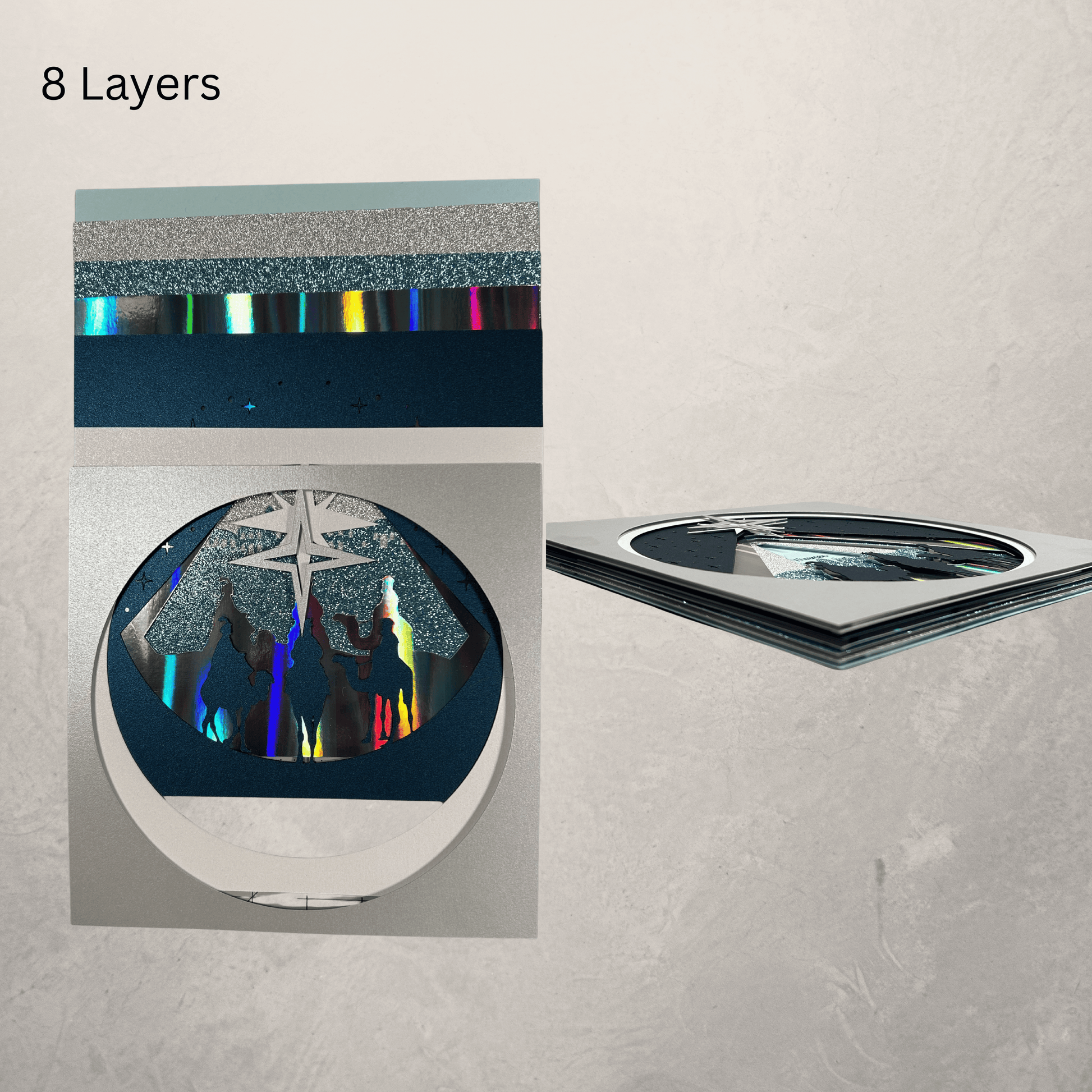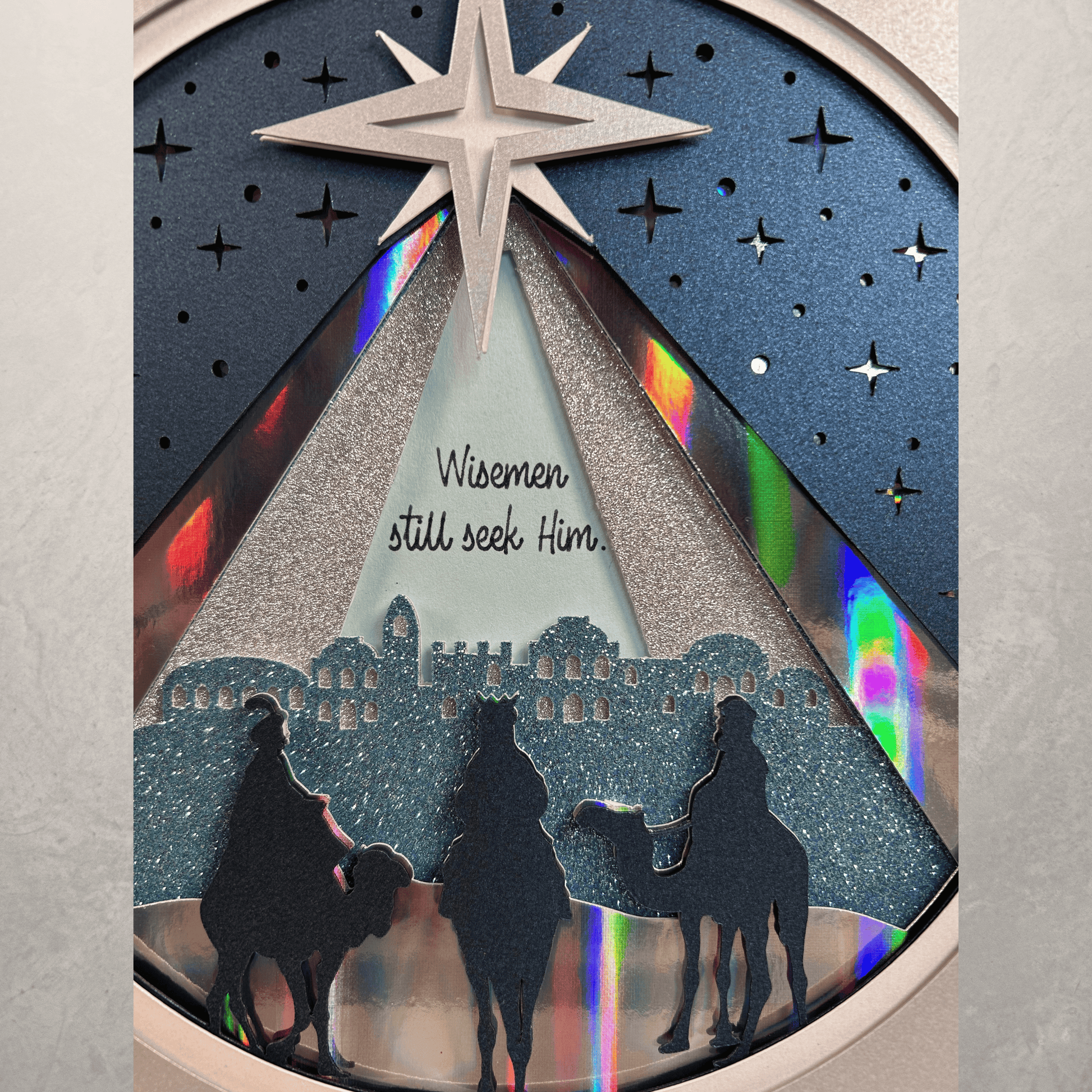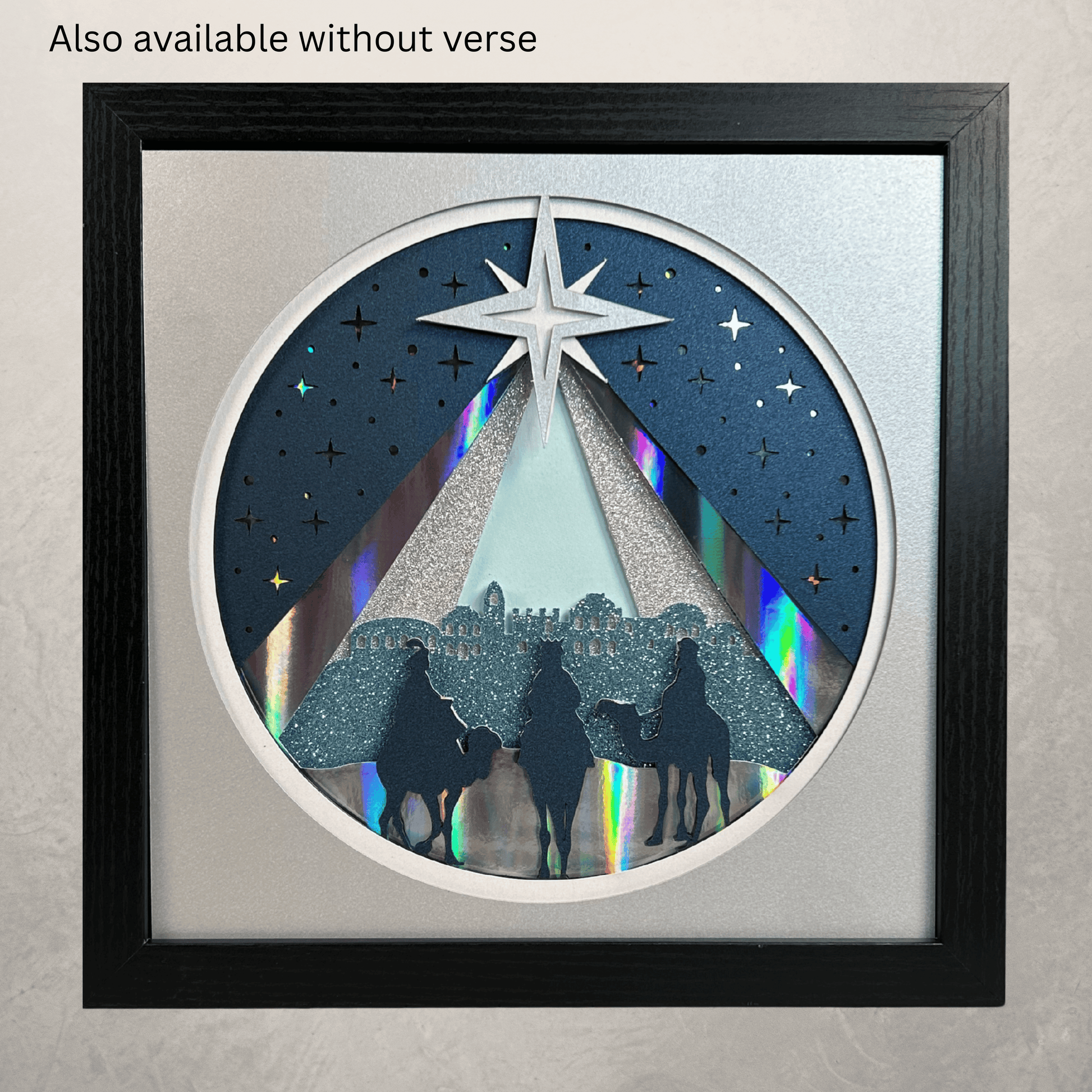 Celebrate the true spirit of Christmas with this exquisite 3D layered shadowbox, meticulously crafted from premium cardstock and featuring the timeless scene of three wise men on camels journeying toward Bethlehem. The radiant star shines above, guiding the way in a dramatic palette of blue, gray, and shimmering silver. The inspirational phrase “wise men still seek him” can be seen in the background, adding a heartfelt touch to your holiday décor. This design is also available without the phrase in the background if you prefer.